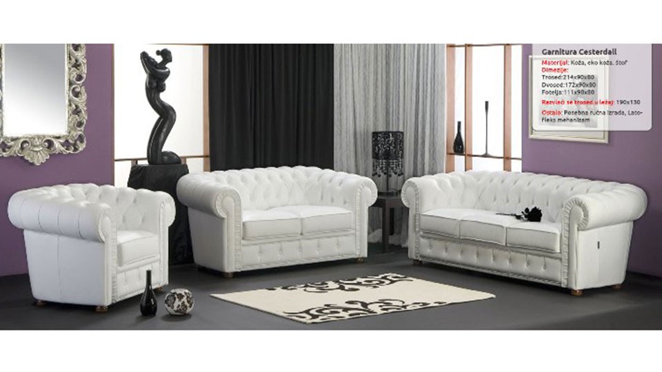 – Trosed 214*90*80 – Dvosed 172*90*80 – Fotelja 111*90*80 Trosed se razvlaci u lezaj 190*130Kožna TDF garnitura. Posebna rucna izrada, latofleks mehanizam.