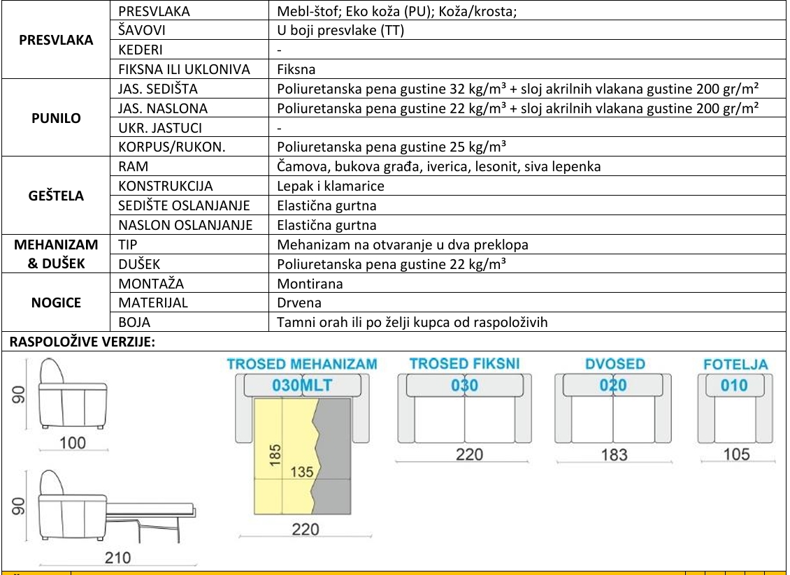 Trosed mehanizam – 220x100x90Dvosed – 180x100x90Fotelja – 110x100x90
