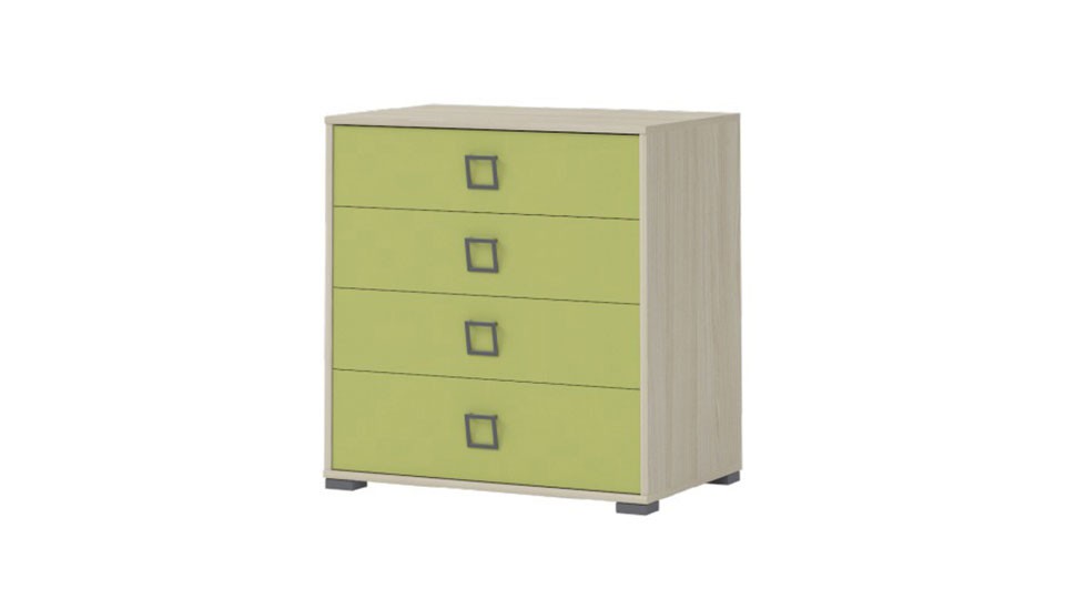 Fiokar sa četiri fioke veoma praktičniih dimenzija učiniće lakšim pakovanje sitnijih odevnih predmeta. Korpus elementa izradjen je od univera, debljine 18mm, u beloj boji sa teksturom drveta ili u drvo dekorima Jasen i Bukva, prema želji kupca. Pri izboru boje fronta, koji je takodje od univera, možete izabrati jednu od pet boja iz naše palete: Pesak, Kivi, Pink, Denim ili belu sa teksturom drveta. Mogućnost fine nivelacije preko podesivih nožica koje su standardni deo opreme fiokara. Korpus elementa kantovan je i sa zadnje strane. Poseduje skrivene klizače sa usporivačima. Zaobljene ivice, kantovane ABS kant trakom debljine 3mm, napravljenom od ekoloških materijala, doprineće bezbednosti Vaše dece. Kompletan okov za nameštaj i montažna šema učiniće sklapanje ovog elementa veoma jednostavnim.