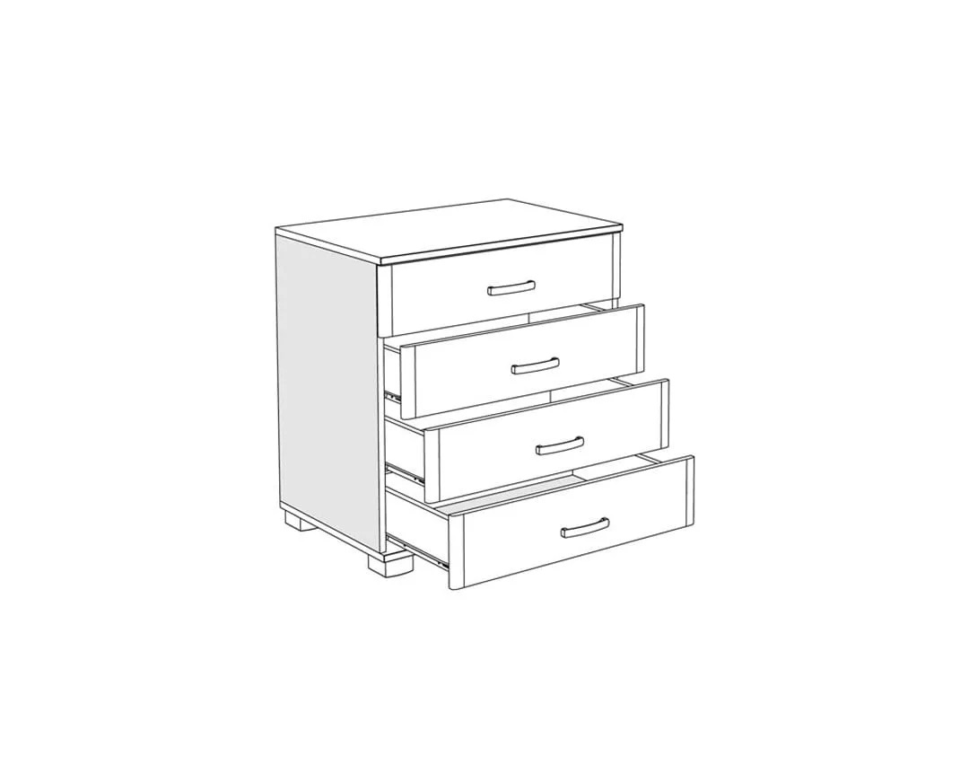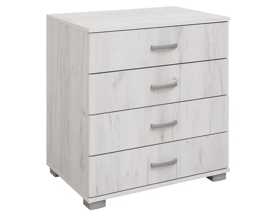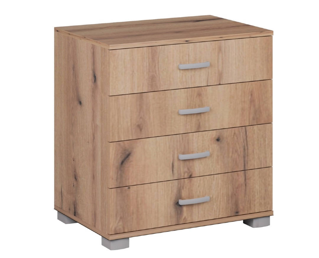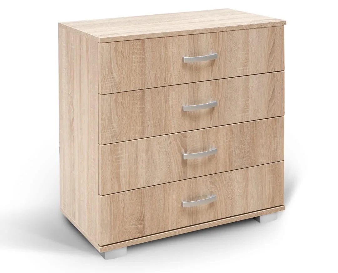 Praktična, komoda ROMA 4. Nastale su upotrebom savremenih tehnologija i materijala po ugledu na moderan dizajn XIX veka. Sa četiri prostrane fioke predstavlja dodatni prostor za odlaganje garderobe, a zbog svoje gabaritne funkcionalnosti, sjajno će se uklopiti i u ambijent dnevne sobe. Gornja površina komode se može iskoristiti za čuvanje dekorativnih predmeta, stone lampe i raznih uspomena. Ručke na fiokama su od metala, a nogari su namenski izrađeni od plastike. Komoda je izrađena od oplemenjenog univera debljine 18mm.