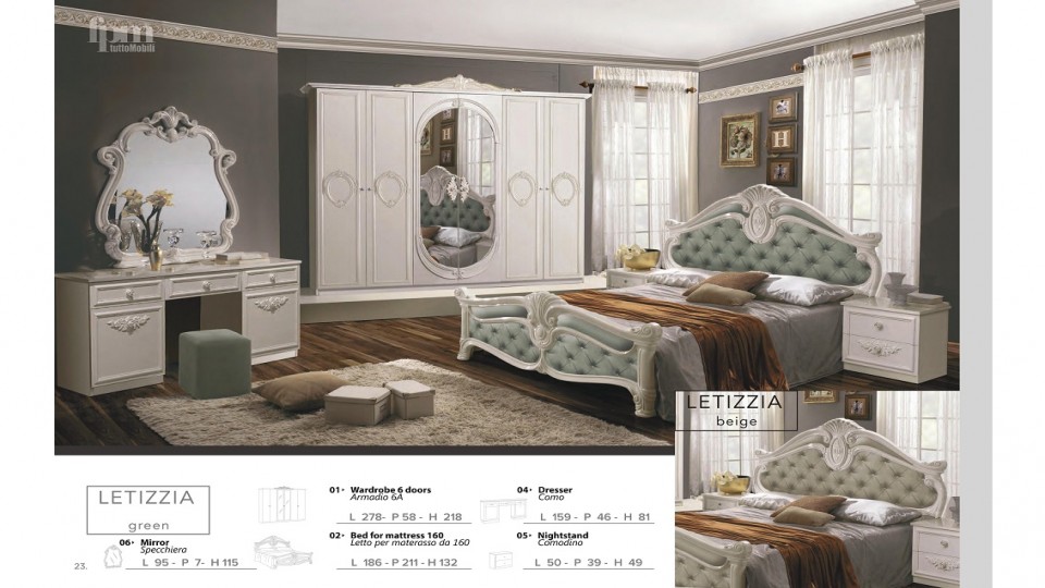 Dimenzije : <ul><li>Plakar – 278x58x218</li><li>Krevet – 186x211x132</li><li>Komoda – 159x46x81</li><li>Noćnik – 50x39x49</li><li>Ogledalo – 95×115</li></ul>