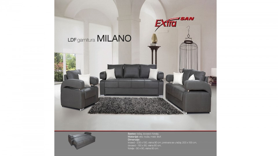 Dimenzije : Trosed – 235x100x80 (pretvara se u ležaj 200×155)Dvosed – 150x90x80Fotelja – 90x90x80