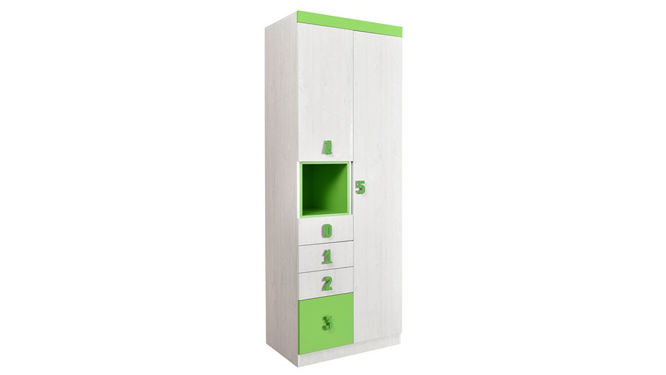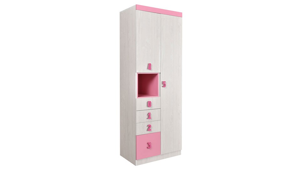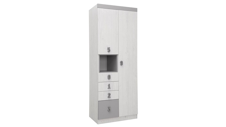Numero Ormar O2V4F Niša izrađen je od oplemenjenog univera debljine 18mm. Ormar se sastoji od velikog skladišnog dela u kojem se nalaze 4 police predviđen je na odlaganje vaše odeće. Levo se nalazi jedna manja vitrina, a ispod nje nalaze se 4 fioke. Dvokrilni ormar Numero O2V4F Niša iz dečijeg programa Numero je u potpunosti prilagođen za odlaganje vaše garderobe.