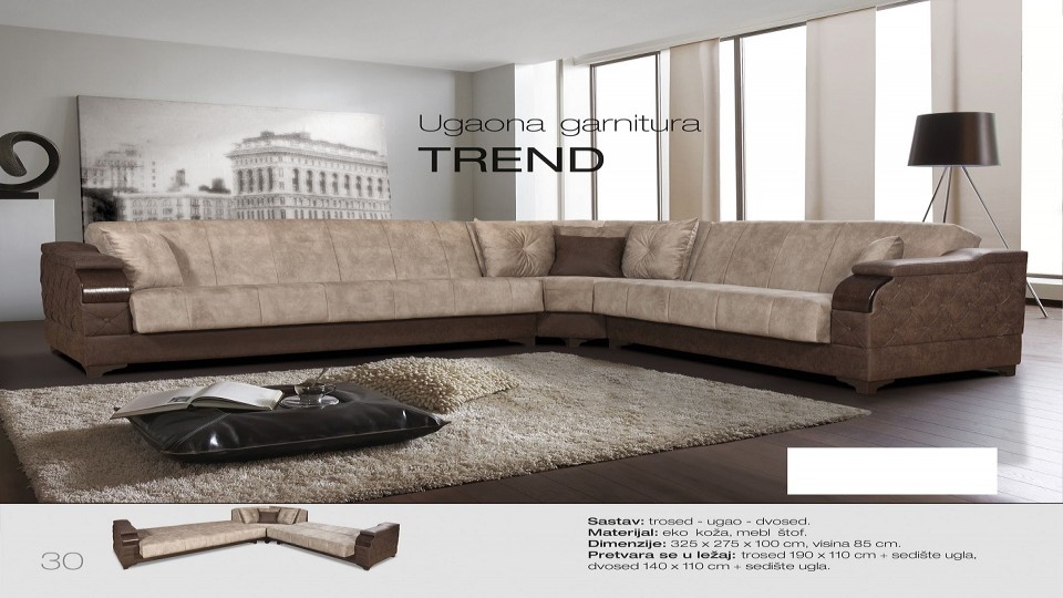 Sastav: Ugaona garnitura Materijal: Eko koža, mebl štof Dimenzije: 325 x 275 x 100 x 85 cm Pretvara se u ležaj Trosed: 190 x 110 cm + sedište ugla, Dvosed: 140 x 110 cm + sedišta ugla