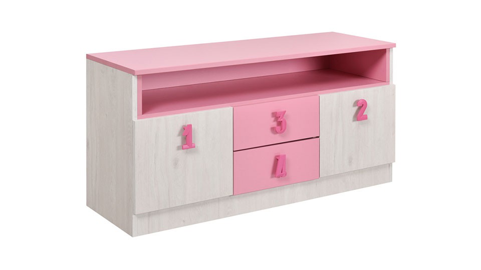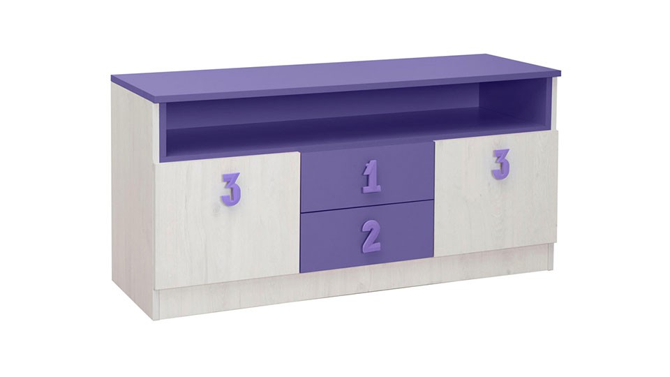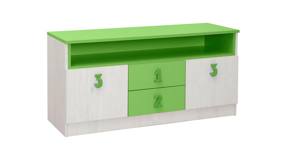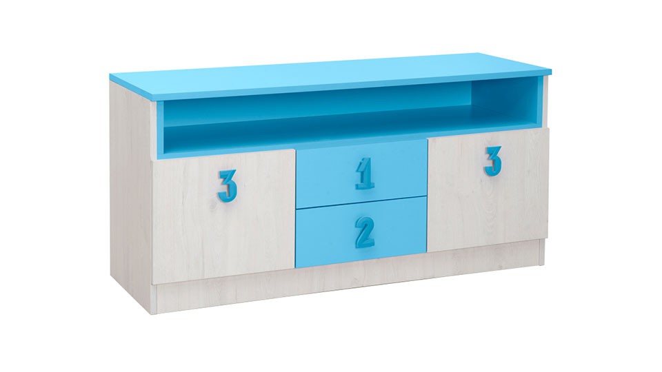 TV komoda Numero svojim dizajnom i bojama savršeno će se uklopiti u dečiju sobu vašeg deteta, a univer debljine 18mm osiguraće kvalitet i dugotrajnost. TV komoda je prilagodljiva svim vrstama i veličinama TV aparata, a praktičanim dizajnom obezbeđen je prostor za DVD i ostale uređaje, zvučnike, itd. TV komoda Numero, šarmantnog dizajna, sa funkcionalnim pregradama, lepo upotpunjuje ambijent kako dečijih, tako i mladalačkih soba. Vesele boje frontova ovoj komodi daju posednu draž.